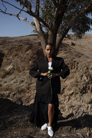 Cette jupe longue à volants joue sur les contrastes entre structure et mouvement.