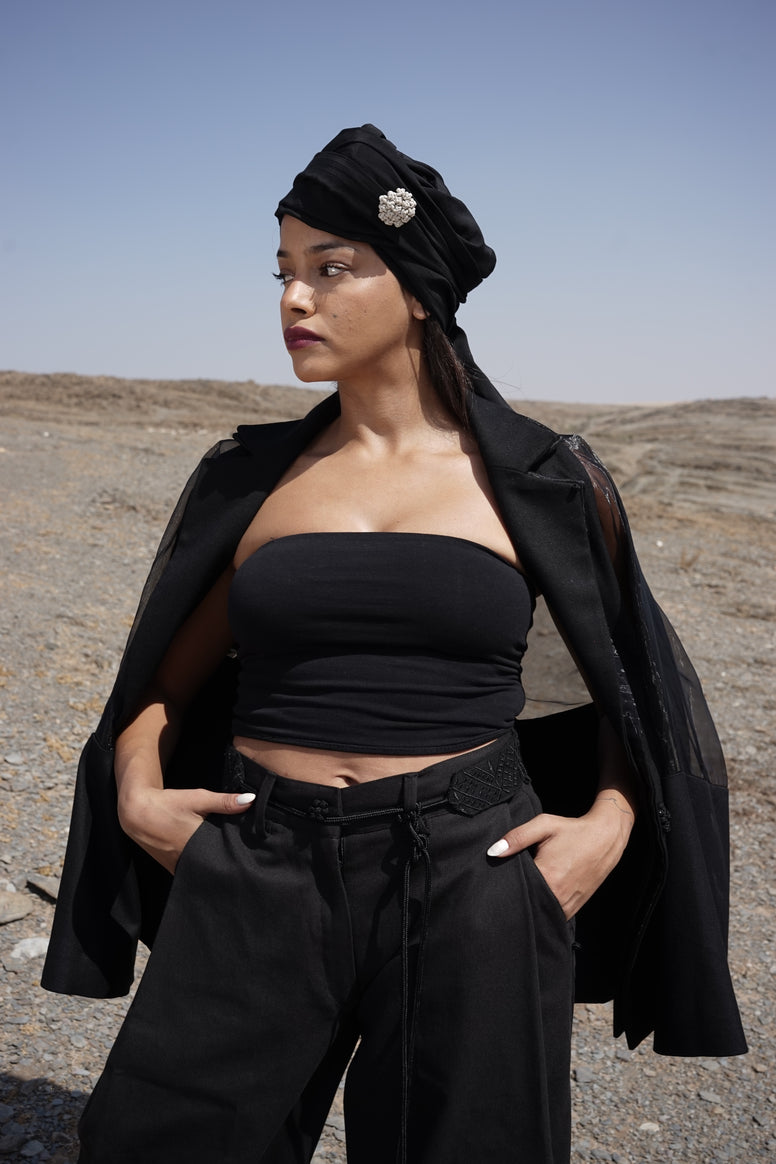 Confectionné dans un tissu léger au tombé structuré, il se distingue par des détails en passementerie marocaine, finement appliqués à la main.